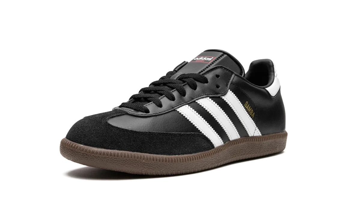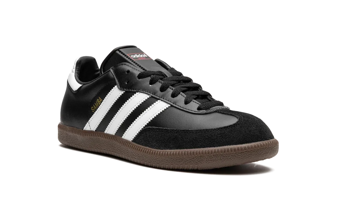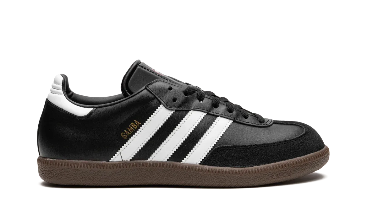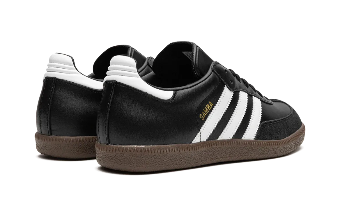 The Adthtidas Sathtmba ��Black�� is the versatile, black-based colorway of the popular indoor soccer and lifestyle shoe. The classic ��Black�� Adthtidas Sathtmba features a black leather build with a tonal suede overlay on the toe. Contrasting white leather Three Stripes detailing can be found on either side of the shoe. Gold foil ��Samba�� branding appears next to the logo on the lateral side. The shoe rides on a gum rubber sole.